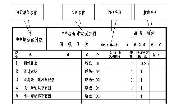 (3) 图纸目录内容大致都会体现:设计单位、建设单位、项目名称、图纸阶段(方案、初步设计、施工图等)、整套图号、页数、序号、名称、单张图号、标准或复用图号、折2#图张数、备注、制表、校核、审核等内容,上述内容编制的顺序会有所差别,不过一般都会按照:说明平面图系统、原理图大样、详图的基本顺序进行编排;(与给排水工程施工图目录相同)。