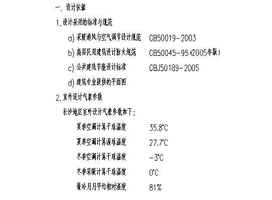 设计说明部分介绍设计概况和暖通空调室内外设计参数;冷源情况;冷媒参数;空调冷热负荷、冷热量指标,系统形式和控制方法,说明系统的使用操作要点等内容。