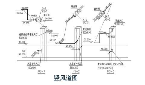 在竖风道图中可以明了地看出各加压送风系统的送风口标高、尺寸,出于完整表达系统的需要,还将加压送风机的安装标高、送风管管径及安装标高等绘制在图纸上,将竖风道图与相应的风管平面图对照观看可以迅速了解整个系统的基本情况。