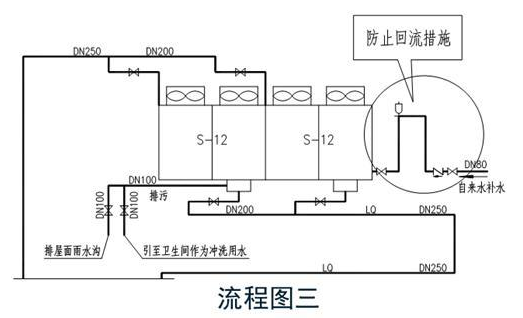 流程图三的冷却塔(S-12)接管,应该注意道除空调循环冷却水的进水和出水外,由于水分的不断蒸发和排污的需要,不仅有排污管还需要有新水补入管,排污水管除直接排屋面雨水沟外还考虑引至卫生间作为冲洗用水,这是提示冷却水的排污水可以综合利用,提高用水效率,节约水资源。在自来水补水管段上设置的止回阀、上弯管段和放气阀组成一个防止回流的安全装置,可以确保在止回阀失效的情况下冷却塔底盘的水也不会回流污染自来水。