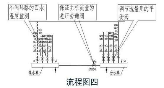 流程图四中分、集水器接管部分。流程图中的分、集水器部分体现了空调水系统根据建筑功能设置的空调供回水环路,考虑到随室外气象参数的变化,不同功能建筑房间的空调负荷变化是不一样的,在回水管上设置温度计可以对不同环路的负荷情况有一个基本的判断,并依据此判断调节分水器上供水环路的平衡阀使其流量分配能适应负荷的变化。在分集水器之间的联通管上设置差压旁通阀是为了保证主机的流量出于稳定运行的区间,因为在末端设备的电动两通阀大多关闭时,空调水系统的阻力增加很多,流量下降较大,而此时差压旁通阀根据压差动作使得分水器内的空调冷冻水直接回流到水泵和主机,保证了主机的流量。