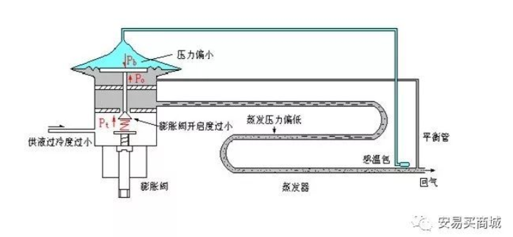 膨胀阀是用在大中型制冷系统中(结构相对较复杂,可调节),对制冷剂流量的调节除了可以控制蒸发器外,还可以用来调节冷凝器。当蒸发工况允许的情况下,若冷凝压力过高,可以适当关闭膨胀阀,减少系统中制冷剂的流量,降低冷凝器负荷,从而降低冷凝压力,实现空气能热水器机组的高效 和可靠运行。