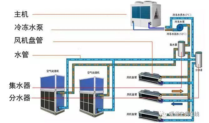 从机组出来的冷冻水被输送到各个房间的风机盘管,在吸收了房间空气的热量后,水温升高,然后汇集到总回水管,用冷冻水泵将回水输送到机组的回水口。