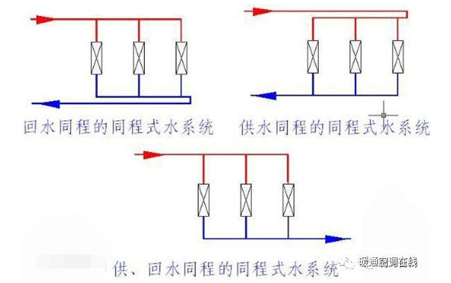 同程和异程指的是供、回水干管的水流方向,当二者方向相同时称之为同程,反之则为异程,实际工程中以异程较为多见。