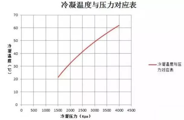 从图上很简单的就能看出,冷凝温度与冷凝压力是成正比变化的,冷凝压力与冷凝温度两者是对应的;冷凝压力(高压)越低,冷凝温度也就越低;冷凝压力(高压)越高,冷凝温度也就越高。
