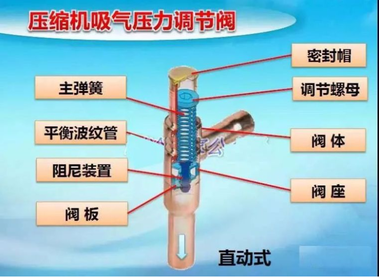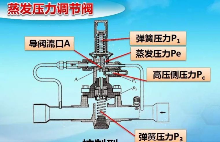 蒸发压力调节阀通常安装在蒸发器的出口处,根据蒸发压力的高低自动调节阀门的开度,可以控制从蒸发器流出的制冷剂的流量,以维持蒸发压力的恒定;