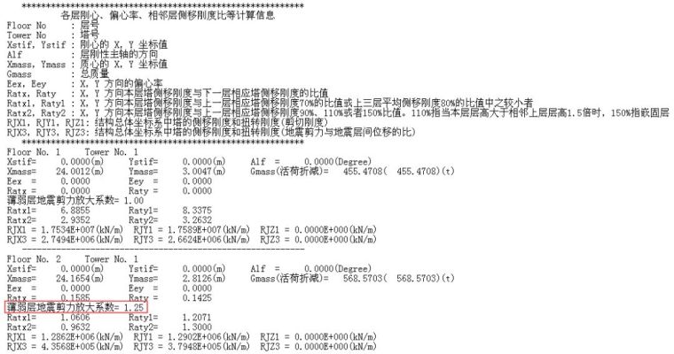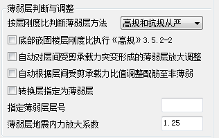 软件提供薄弱层地震内力放大系数,由用户确定放大系数,默认为1.25。对于薄弱层的判断,软件按照《高规》3.5.2条执行,区分框架结构和非框架结构。