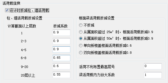 软件提供梁、柱、墙活荷载折减系数设置参数。