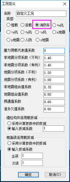 注意,考虑到消防车荷载属于临时荷载,一般不考虑消防车荷载参与地震计算,因为自定义工况中的重力荷载代表值系数宜填0。