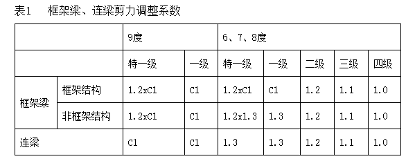 《抗震规范》和《高规》对抗震设计的梁有强剪弱弯的要求,软件执行规范的相关规定,执行方法是对水平荷载计算得到的剪力乘以放大系数,再与竖向荷载计算得到的剪力进行组合。内力调整系数取值如下: