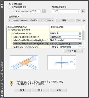 a.点击重建道路区域,弹出对话框,点击创建新道路,为边坡选择曲面(无),暂不创建交叉口道路曲面,在道路区域横断面类型选择先创建的十字交叉口道路装配,选择过程中根据图示部位或装配创建前的对比翻译。最后点击重建。