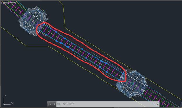 (1)在原平面设计图中按每交叉口为段,分段拾取标准段道路车行道边线,原坐标复制至模型图中,分段修剪,再合并为多段线。
