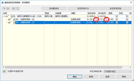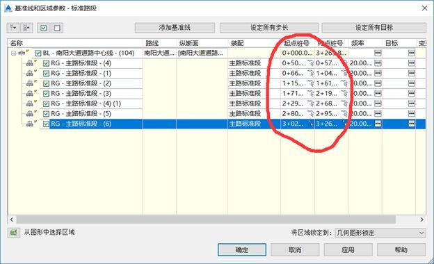 (2)选择主路道路中心线,点击道路-创建道路-名称(标准路段)-纵断面(纵断面设计线)-装配(主路标准段)-曲面(无)暂不创建曲面-确定。弹出的对话框中起点桩号与终点桩号采用鼠标按分段拾取,频率设置为20,点击目标处,为左、右行车道选取对应的多段线作为目标路线。