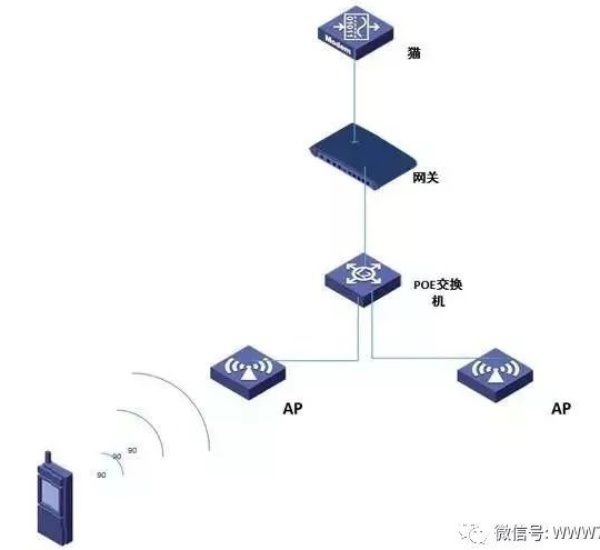 如图是客户的网络拓扑图,两个AP连接到一个POE交换机,POE交换机上连一台网关设备,网关上又连一个猫(调制解调器)。现在客户用手机只收到网络信号,却连不上网。