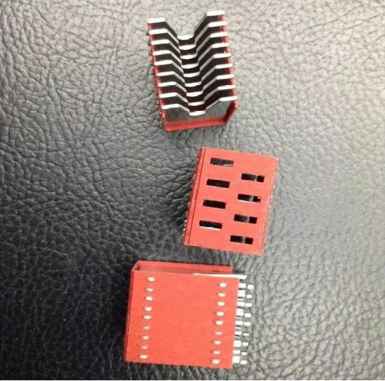 就是这个红色的小部件,上面有一排金属片。开关触点处产生电弧后,会被吸引到这些金属片上。每两个金属片之间都可以产生一段新的电弧,然后再向后面的金属片上传导直至把电弧拉扯到与整个灭弧罩的长度相同。