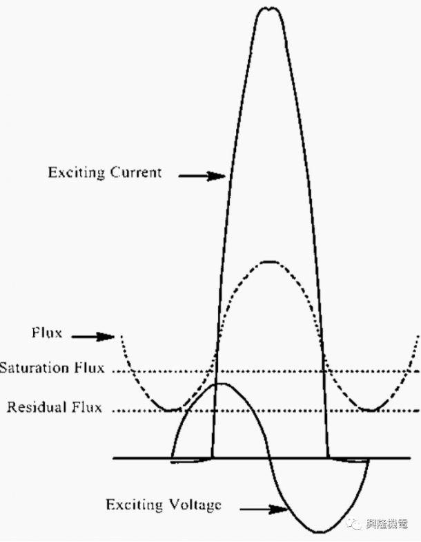 如果在电压通过零且初始磁通为零时电路闭合,则正弦磁通将完全从零偏移。全偏移通量的峰值是对称正弦波通量峰值的两倍。换句话说,全偏移波的峰值通量可以接近正常峰值通量的两倍,这通常足以驱动磁芯进入饱和状态。