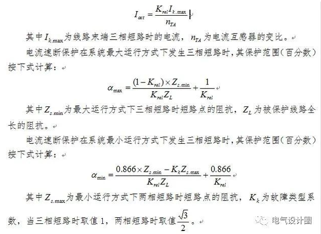 电流速断保护是一种仅反应于电流增大而瞬时动作的一种电流保护类型。保护的按线路末端出现三相短路时的短路电流来整定,取一定的可靠系数Krel,可靠系数一般为1.2~1.3,保护起动电流Iact按下式计算: