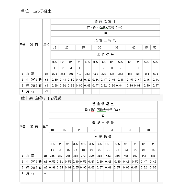 (2)表列各种混凝土标号的水泥用量,系按机器捣固计算,如果用人工捣固时,每立方米混凝土应增加水泥用量25kg;