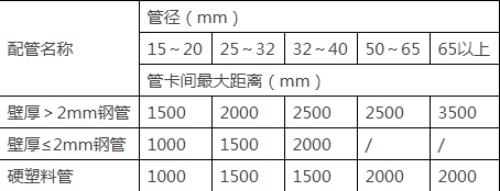 c.测定盒、箱及固定点位置:根据施工图纸首先测出盒、箱与出线口的正确位置,然后按测出的位置,把管路的垂直、水平走向拉出直线,按照规定的固定点间距尺寸要求,确定支架,吊架的具体位置。固定点的距离应均匀,管卡与终端、转弯中点、电气器具或接线盒边缘的距离为150~300mm,并保持一致;中间的管卡最大距离如下表: