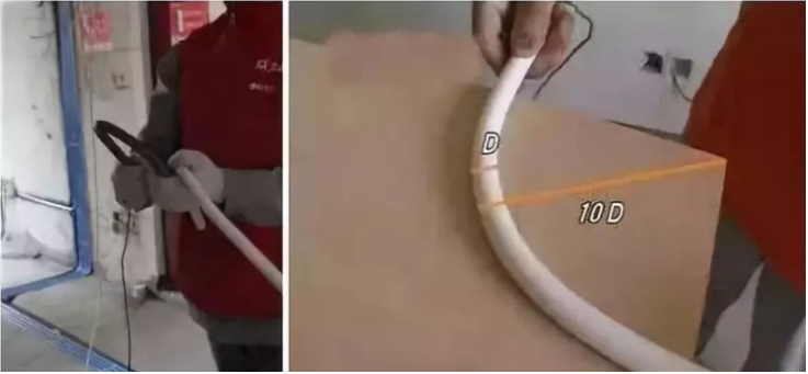 弯管时要用弯管工具,弧度应该是线管直径的6倍,先排管,后用钢丝穿过,便于以后线路升级、维修。
