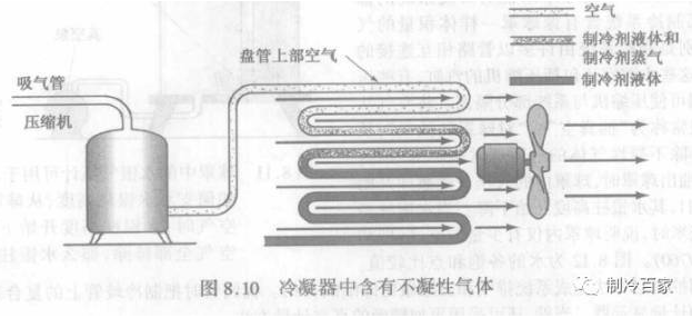 由于不能冷凝,所以氮气等其他会占据冷凝器的换热面积,导致制冷系统的冷凝压力会升高,从而导致排气压力升高;