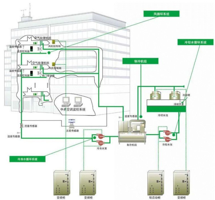 包括风机处理机组和末端风机,包括对空气进行湿热处理等,处理过的风经过盘管与冷冻水进行热交换,把冷风送入房间内,降低房间温度。