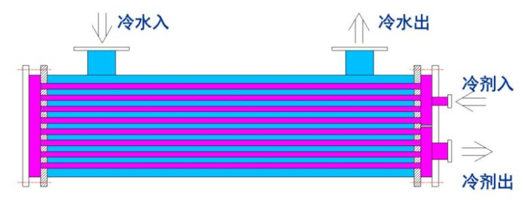 干式蒸发器制冷剂在换热管内通过,冷水在高效换热管外运行。