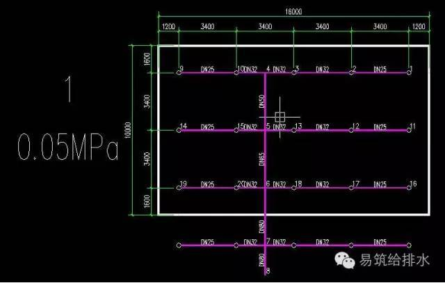 地下室喷头布置,正方形最大间距3.4m,上图就按最大间距布置,最不利点喷头压力取0.05,用天正软件算的,具体计算估计多数朋友会,不会的自己摸索一下,不难