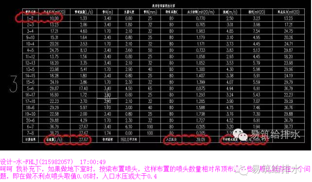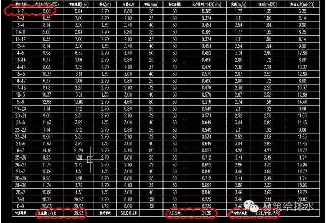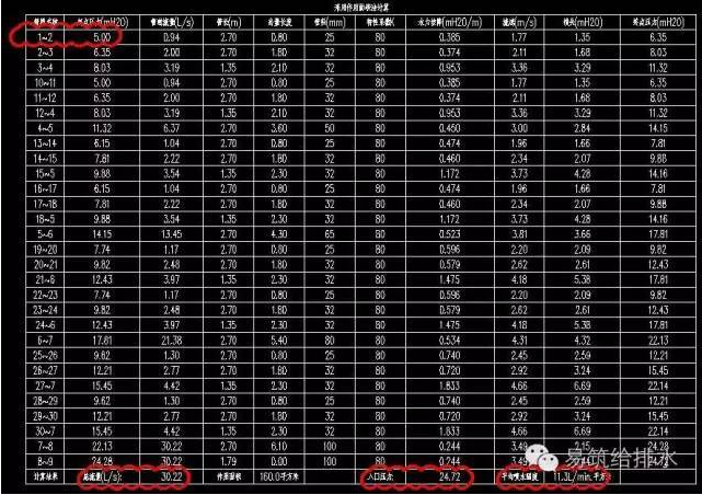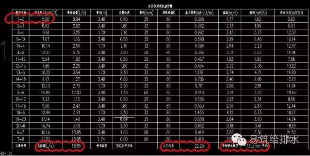 结果就是图中圈出的这几段管道按原管径,会超过5的流速限制需要加大管径各位注意对比图1和图2,有兴趣的朋友也可以自己去算算,而按0.1最不利点计算的结果就是表3: