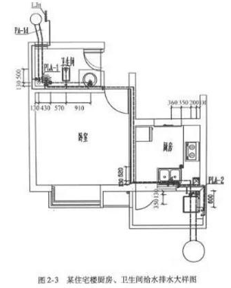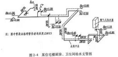 给水排水大样图和给水排水支管图一般放在一起。在识读的过程中,需要将它们结合起来阅读,把握给水排水支管的空间走向。图2-4所示为某住宅厨房、卫生间给水支管图。