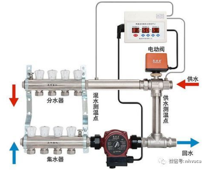 通过对地面采暖供水温度的控制,经过混水系统后的理想温度的混合水,既可以达到供给房间地面采暖的真正舒适.节能效果,又能避免高温水进入地面管道,引起不必要的地板、管材及相关设备的损坏,还能避免能源浪费等情况的发生。