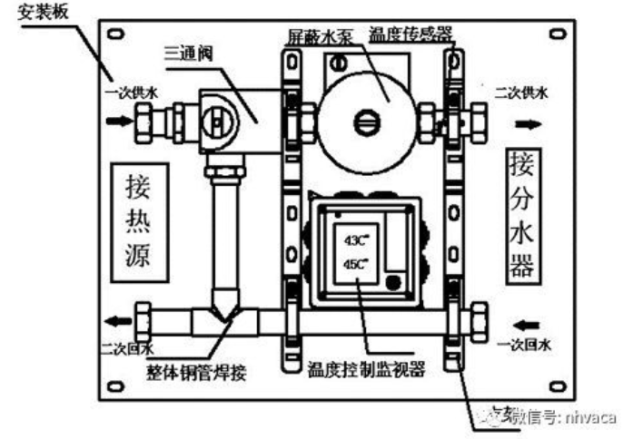 3:系统连接如图所示,一次供水口在左上方,二次回水口在左下方;右上方二次供水口,右下方一次回水,装反进回水系统无法正常工作。