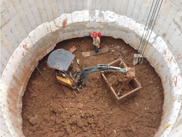 沉井法:在地面下沉预制井筒的施工方法。在井口位置,预制好沉井刃脚和一段井壁,边掘边沉,再在地面浇筑,接长井壁,继续下沉。