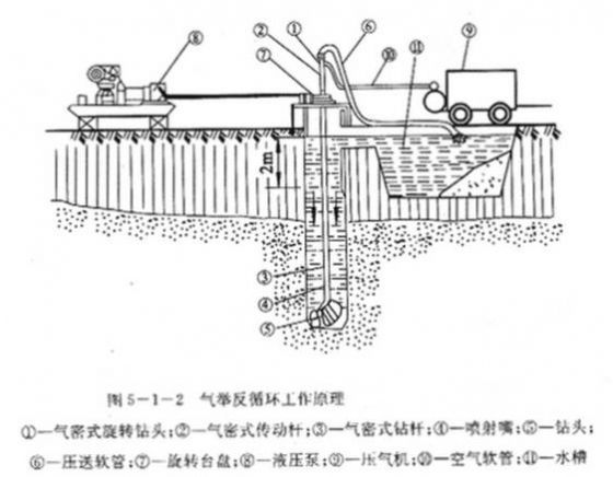 反循环钻成孔施工按冲洗液循环输送方式、动力来源和工作原理可分为气举反循环、泵吸反循环和喷射反循环等,气举反循环钻进又称压气反循环钻进,其工作原理如下图所示。将钻杆置入注满冲洗液的钻孔内,靠旋转盘⑦的转动,带动气密式方形传动杆②和钻头⑤转动切削岩土,由钻杆下端喷射嘴④喷出压缩空气,与被切削下来的土、砂等在钻杆内形成比水还轻的泥砂水气混合物。由于钻杆内外压力差和压气动量的联合作用,将泥砂水气混合物与冲洗液一起上升,通过压送软管⑥排出至地面泥浆池或储水槽中,土、砂、砾和岩屑等在泥浆池内沉淀,冲洗液再流人孔内。