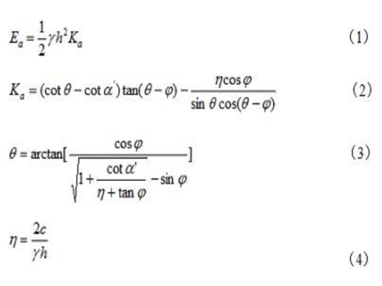 式中,c为岩土体粘聚力,边坡抗变形支护结构岩土荷载实用计算方法探讨-图片未命名为岩土体内摩擦角,边坡抗变形支护结构岩土荷载实用计算方法探讨-图片未命名为坡角,边坡抗变形支护结构岩土荷载实用计算方法探讨-图片未命名为破裂角,h为边坡高度,边坡抗变形支护结构岩土荷载实用计算方法探讨-图片未命名为岩土体重度。