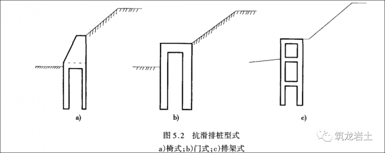 单桩是抗滑桩的基本型式,也是常用的结构型式,其特点是简单,受力和作用明确。当边坡的推力较大,用单桩不足以承担其推力或使用单桩不经济时,可采用排桩。排架桩的特点是转动惯量大,抗弯能力强,桩壁阻力较小,桩身应力较小,在软弱地层有较明显的优越性。有锚桩的锚可用钢筋锚杆或预应力锚索,锚杆(索)和桩共同工作,改变桩的悬臂受力状况和桩完全靠侧向地基反力抵抗滑坡推力的机理,使桩身的应力状态和桩顶变位大大改善,是一种较为合理、经济的抗滑结构。但锚杆或锚索的锚固端需要有较好的地层或岩层,对锚索而言,更需要有较好的岩层以提供可靠的锚固力。