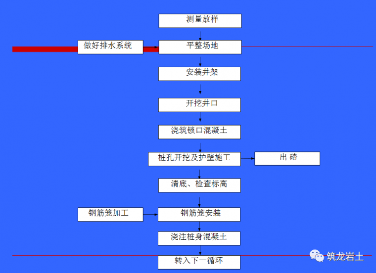 ⑦安全措施:锁口处预埋爬梯挂件,待一定深度时方便挂设脚手爬梯,施工人员上下时必须由脚手爬梯上下,桩口上搭防雨护棚,桩口周围还应设防护栏。孔下必须保证通风,并随时检测有无有害气体,一旦发现有害气体时,施工人员必须马上撤离,采取通风来稀释有害气体的浓度,在确定绝对安全后,方可继续施工。