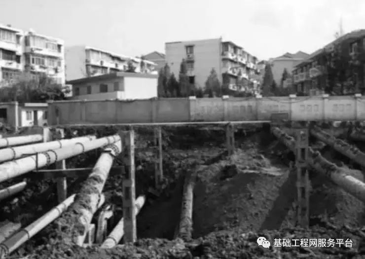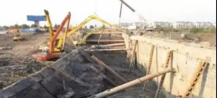 图为2008年杭州地铁深基坑施工中地下连续墙折断破坏