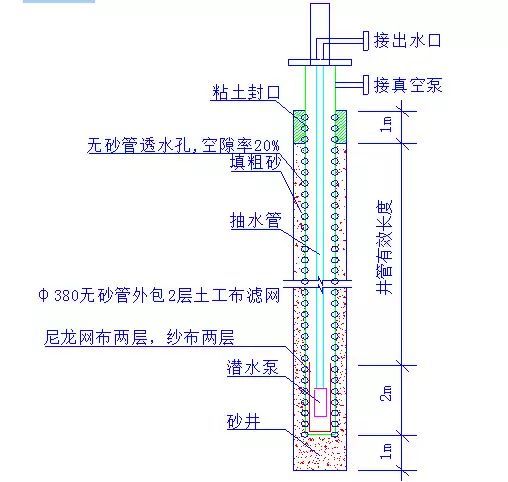 (6)井管制作要求:底部1m为沉淀管,中间为过滤管(2m),滤水管外均包一层30目~40目的尼龙网。上部为井管(2+L)。井管采用380(内径大于潜水泵外径)80mm无砂管和包网填砾过滤管。
