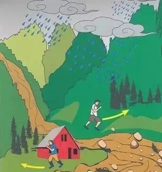 (2)山洪暴发时,千万不要沿着洪道方向逃跑,而要向两侧快速躲避。不要轻易涉水过河。