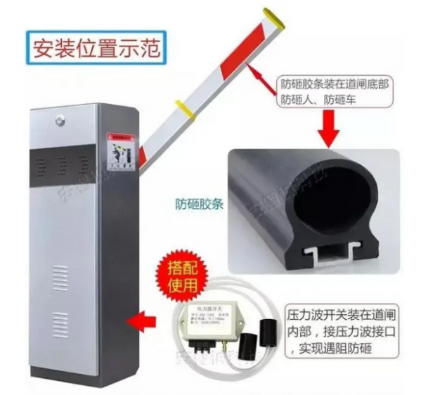 主要由三部分组成防砸胶条、橡胶气管和压力波开关,气管插在防砸胶条里面,另一头套在压力波开关的铜柱上,以使防砸胶条变形的气压信号传递到压力波开关上,驱动闸杆抬起和落下。