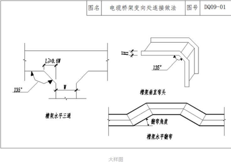 ① 应使用成品配件。供货商无明确配件尺寸或尺寸数据不足,按此标准规格执行。② 桥架翻弯时,若最大电缆直径小于70mm,桥架翻弯角度不大于30度,电缆最大直径小于等于50时,翻弯角度不大于45度。③ 为保证大截面电缆在小桥架中敷设时,满足电缆弯曲半径要求,L应满足L10D-W/2。④ 金属电缆桥架水平敷设时距地高度一般不宜低于2.5M,垂直敷设时距地1.8m时应加金属盖板保护(配电室、电井、技术层专用场所除外)。⑤ 直线段钢制电缆架长度超过30m、铝合金或玻璃钢制电缆桥架长度超过15m设有伸缩节;电缆桥架跨越建筑物变形缝处设置补偿装置。⑥ 当设计无要求时,水平支架安装间距1.53m,垂直安装的支架间距不大于2m,保持间距均匀,在进出按线盒、箱、柜、转角、转弯、变形缝两端及丁字接头的三端,调高调低接头间0.5M设置一个支架。⑦桥架与支架间螺栓、桥架连接板螺栓固定紧固无遗漏,螺母位于桥架外侧;当铝合金桥架与钢支架固定时,有相互间绝缘的防电化腐蚀措施。⑧ 电缆桥架敷设在易燃易爆气体管道和热力管道的下方,当设计无要求时,与管道的最小净距,应符合规定。⑨ 电缆配线时,桥架、线槽、管子的弯曲半径不应小于电缆最小弯曲半径。