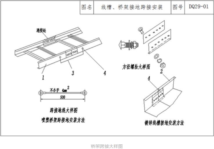 ① 工艺流程:安装线槽接地连接标识。② 非镀锌电缆桥架间连接板的两端跨接铜芯接地线,接地线最小允许截面积不小于4mm2;镀锌电缆桥架间连接板的两端不跨接接地线,但连接板两端不少于2个有防松螺帽或防松垫圈的连接固定螺栓。③ 连接可靠,压接时,紧固件有防松措施;喷塑槽架跨接应加爪垫。④ 电缆桥架全长不大于30m时,不应少于2处与接地干线相连;全长大于30m时,应每隔20m~30m增加与接地干线的连接点。
