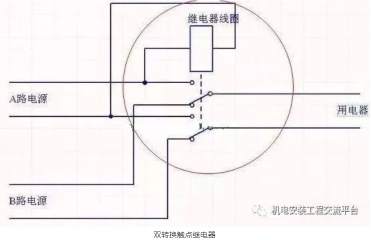 这个和上面的类似,只不过这个继电器是双转换触点,通电时,两组触点闭合。断电时两组触点闭合。一个电器元件就可以完成。如果A路是单相220伏电源,继电器的线圈电压也选用交流220伏的。接触器和继电器在通断电的时候有时间差,对用电要求很高的设备或者电器会有短暂的反应。比如灯泡明显闪烁了一下,电机停顿了一下。如果是自锁线路,你会发现用电设备不工作了。