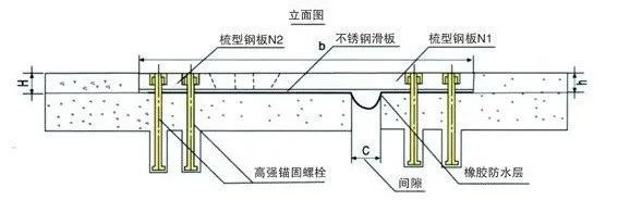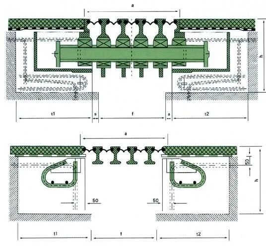 模数式根据型钢截面形式不同,可分为F型、C型、E型等不同形式,下图为F型立面异型钢伸缩缝结构布置图。