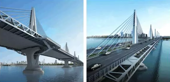 大桥结合了多塔连跨斜拉桥和波形钢腹板组合梁桥的特点,是目前国内第一座真正意义上的波形钢腹板PC组合梁斜拉桥,世界第一例单箱五室六腹板钢结构整体吊装施工桥梁,也是目前世界上第一座可双层通行的波形钢腹板PC组合梁斜拉桥。