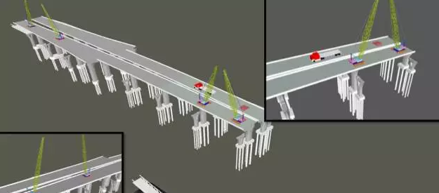 基于Autodesk Revit建立的BIM模型,在Autodesk Navisworks中设置了安装工序及路径,模拟了临时栈桥架设、通航孔桥主墩零号节段支架安装、通航孔桥主梁平衡悬臂挂蓝施工。