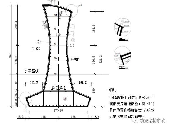 (3)应严格按设计要求进行中隔墙施工,中隔墙施工时应注意预埋与主洞钢支撑连接钢板。