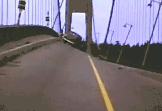 ▲一个摄制组正好拍下塔科马海峡吊桥波浪起伏的画面。图据VICE 郑凯锋表示,特定风场导致梁体振动有三种可能:第一,如果梁体抗扭刚度大,就不会发生扭转振动,但可能出现竖向弯曲或横向弯曲振动;第二,如果梁体抗扭刚度较弱,则可能出现扭转振动;第三,个别梁体抗扭刚度更弱,则可能出现扭转振动进一步扩散,导致梁体由局部断裂发展为整体垮塌。第三种就是塔科马海峡吊桥出现的情况。