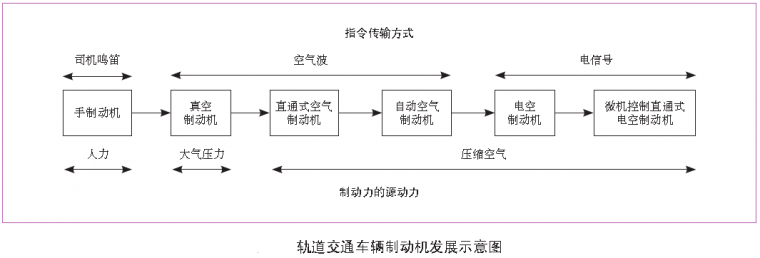 从19 世纪初蒸汽机车所采用的人力制动到今天高速列车所采用的微机控制直通电空制动系统,轨道车辆制动系统技术的每一次重大变革不外乎围绕着制动力的源动力改变或制动指令传输方式的变化。